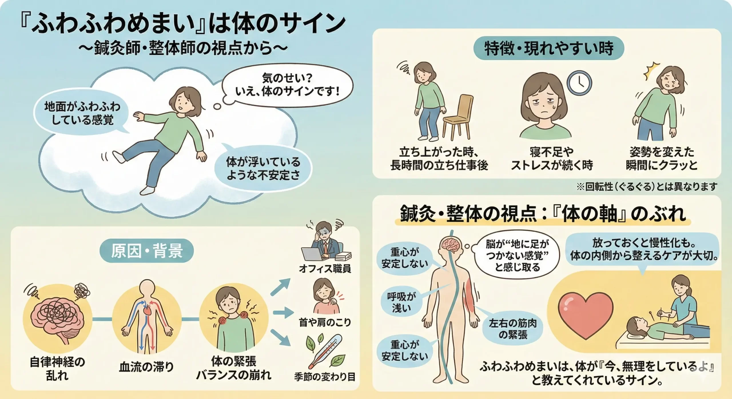 • 「ふわふわめまい」は自律神経の乱れや血流・体の歪みなど、全身のバランスの崩れから起こることが多い。
