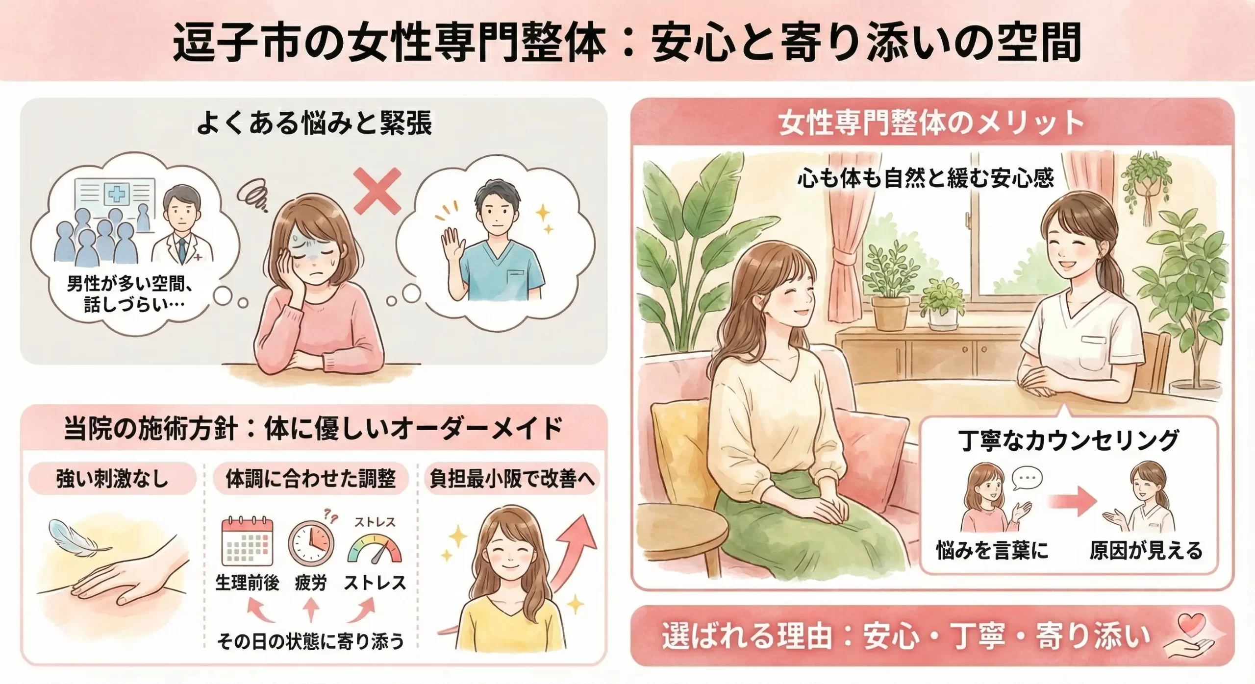 - 逗子市で女性専門整体が選ばれている背景と、安心して通える理由