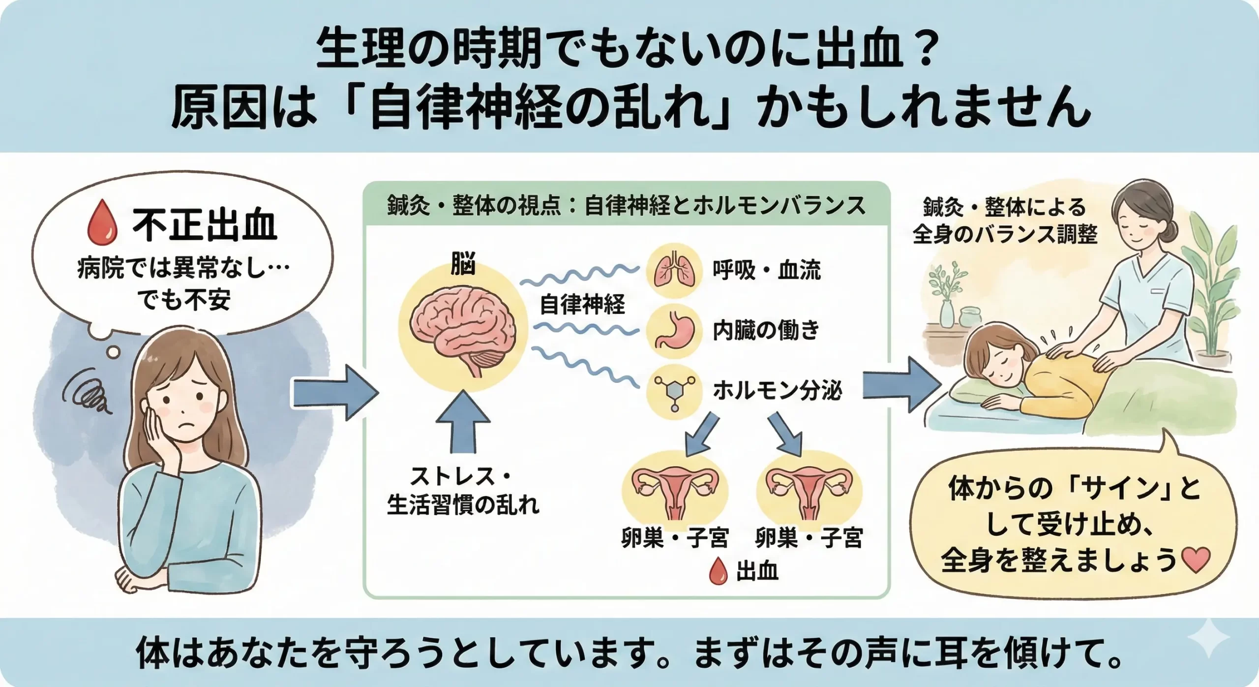 鍼灸や整体の現場では、こうした不正出血のお悩みと自律神経の乱れが同時に見られるケースをよく経験します。この記事では、鍼灸師・整体師の視点から「自律神経失調症と不正出血の関係性」や「体が出しているサイン」、そして日常で意識したいポイントについて、わかりやすくお伝えします。