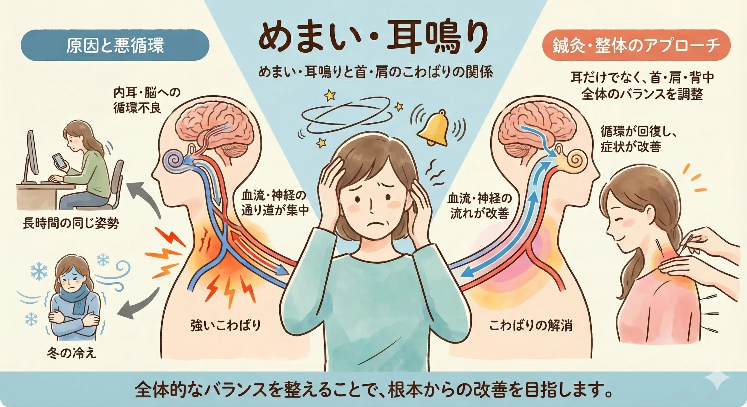 しかし、首や肩、耳まわりは、血流や神経の通り道が集中している非常に重要な場所です。冬の冷えや長時間同じ姿勢でいることにより、この部分の緊張が強くなると、内耳や脳への循環に影響を及ぼし、めまいや耳鳴りとして現れることがあります。