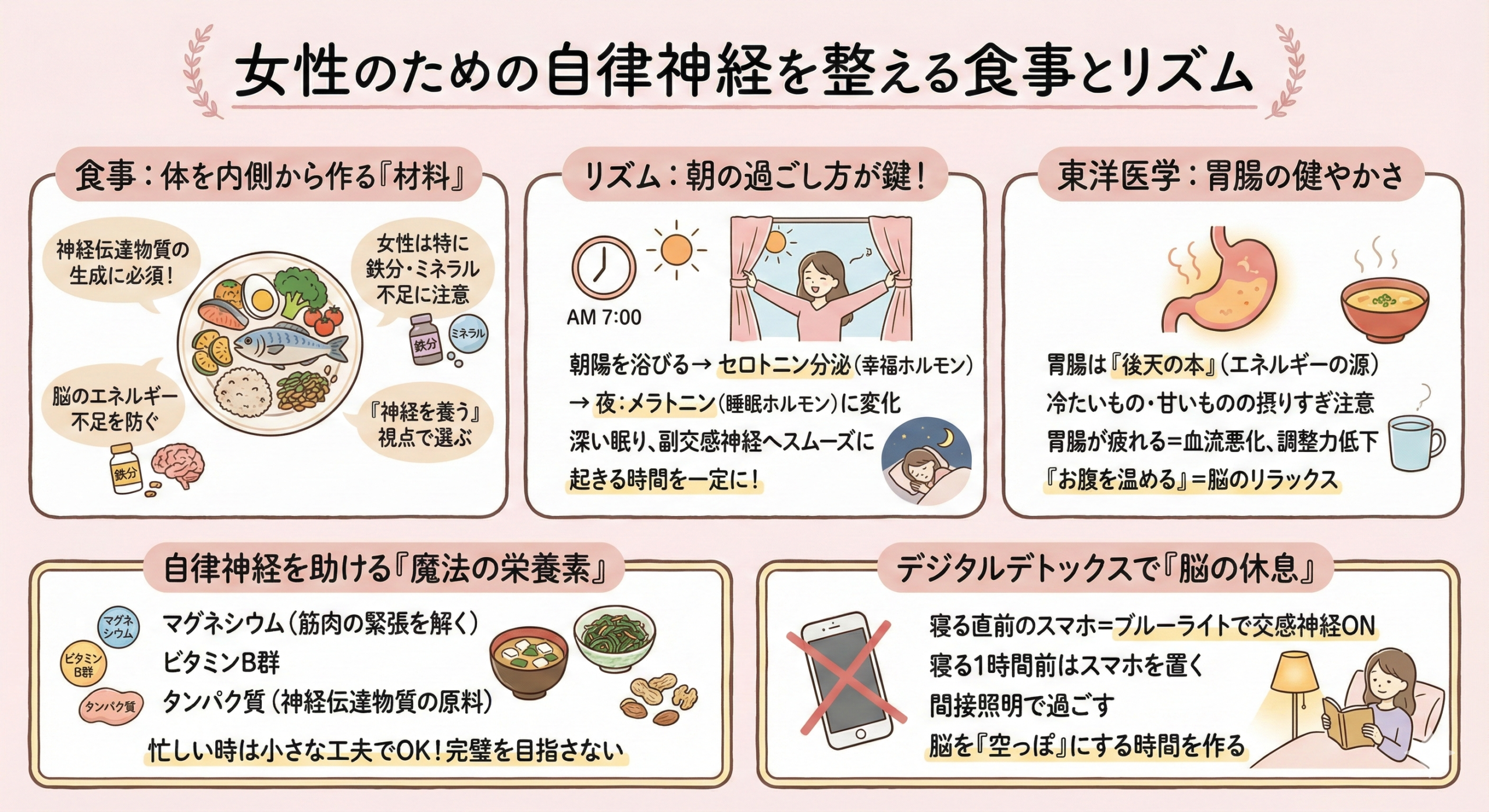 自律神経を整えるためには、外側からのケアだけでなく、体を作る「材料」である食事と、活動の「リズム」を整えることが不可欠です。私たちの体は食べたものでできており、神経伝達物質の生成には特定の栄養素が欠かせません。特に女性は月経の影響で鉄分やミネラルが不足しやすく、これが原因で脳がエネルギー不足を感じ、自律神経がパニックを起こして乱れるケースが非常に多く見られます。まずは、お腹を満たすだけでなく「神経を養う」という視点で食事を選んでみましょう。