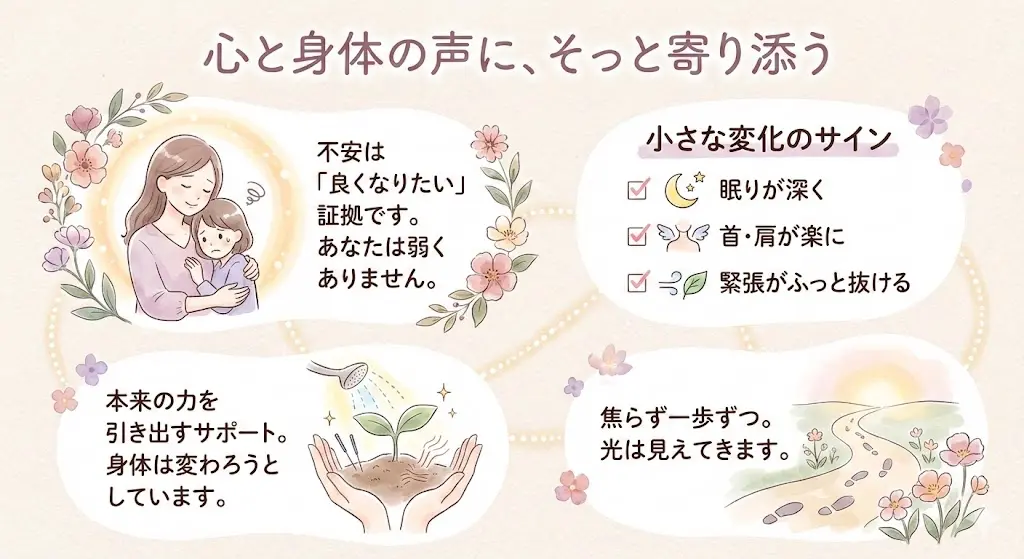 今はつらくても、一人で抱え込まず、身体の声に耳を傾けながら、少しずつ前へ進んでいきましょう。