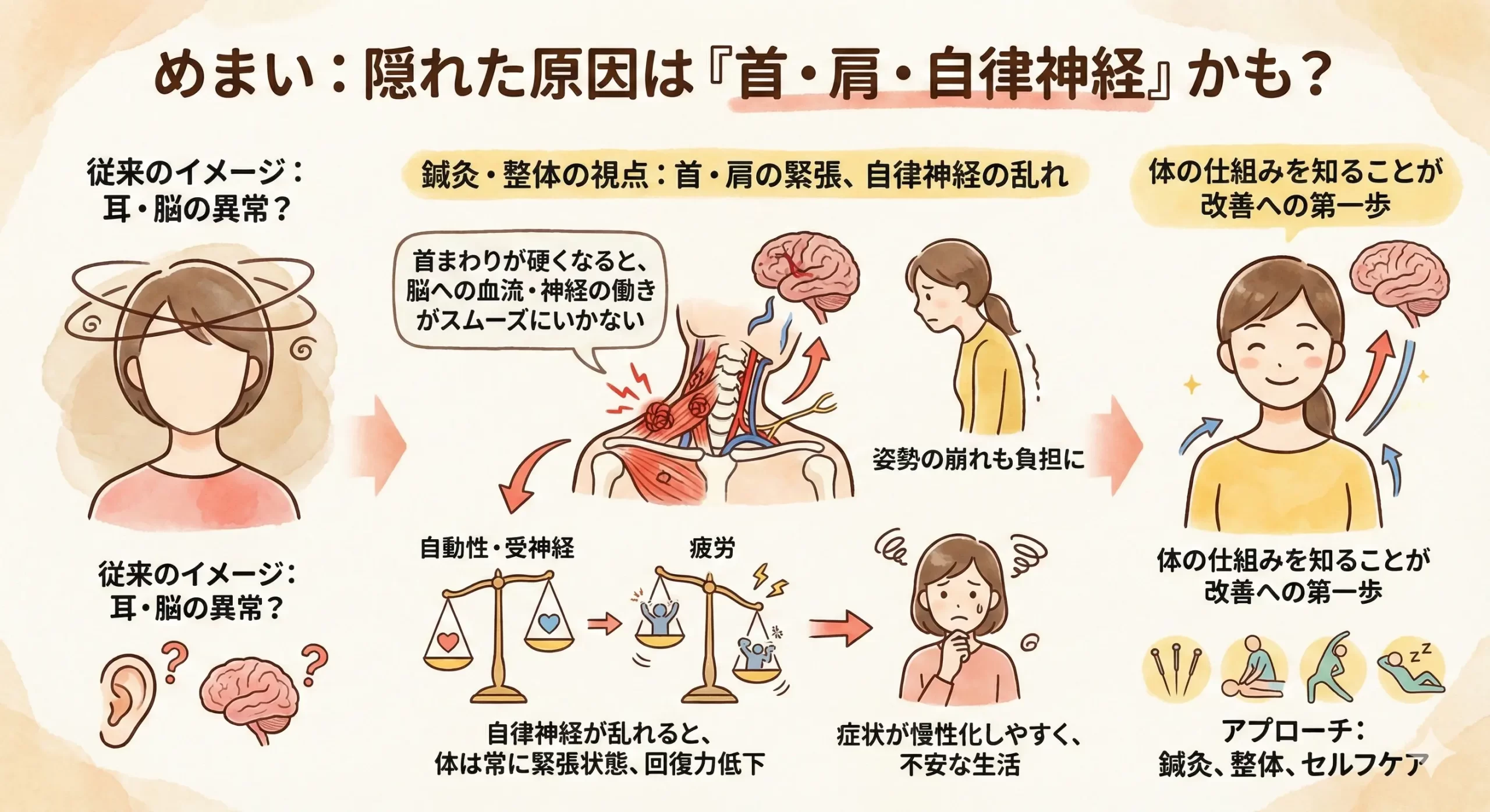 • めまいは耳や脳だけでなく、首・肩の緊張や自律神経の乱れが関係していることが多い