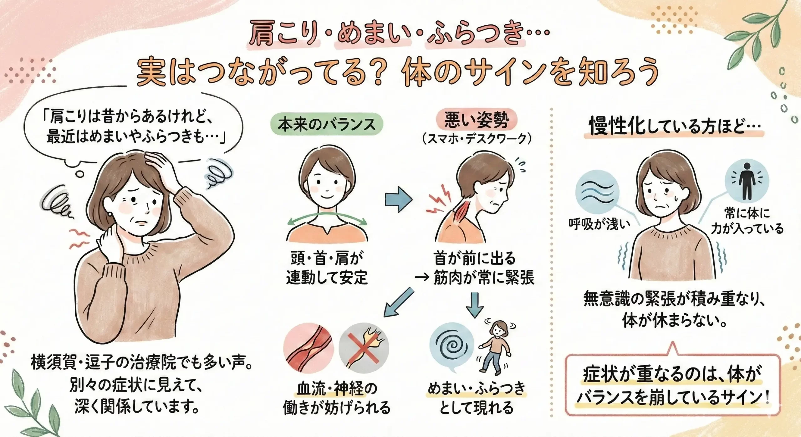 「肩こりは昔からあるけれど、最近はめまいやふらつきも出てきた」——このような声は、横須賀から逗子市の治療院に来られる女性からよく聞かれます。一見すると別々の症状のように感じられますが、実はめまいと肩こりは深く関係していることが少なくありません。体の仕組みを知ることで、不安が和らぐ方も多いです。