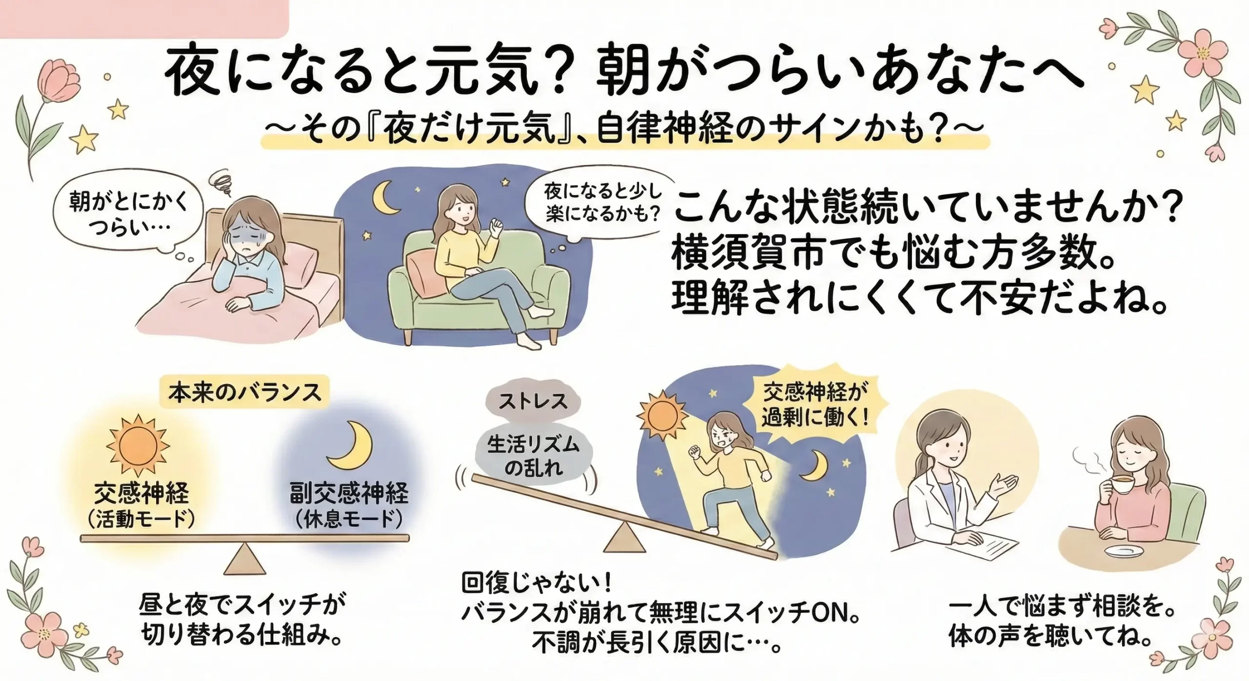 横須賀市で自律神経の不調に悩み、「夜になると元気」という状態に違和感を覚えている方は、一人で抱え込まず、体の状態を丁寧に見てもらえる場所を選択肢に入れてみてください。早めに向き合うことで、日常を少しずつ取り戻せる可能性は十分にあります。自分の体の声に耳を傾けることが、回復への第一歩です。