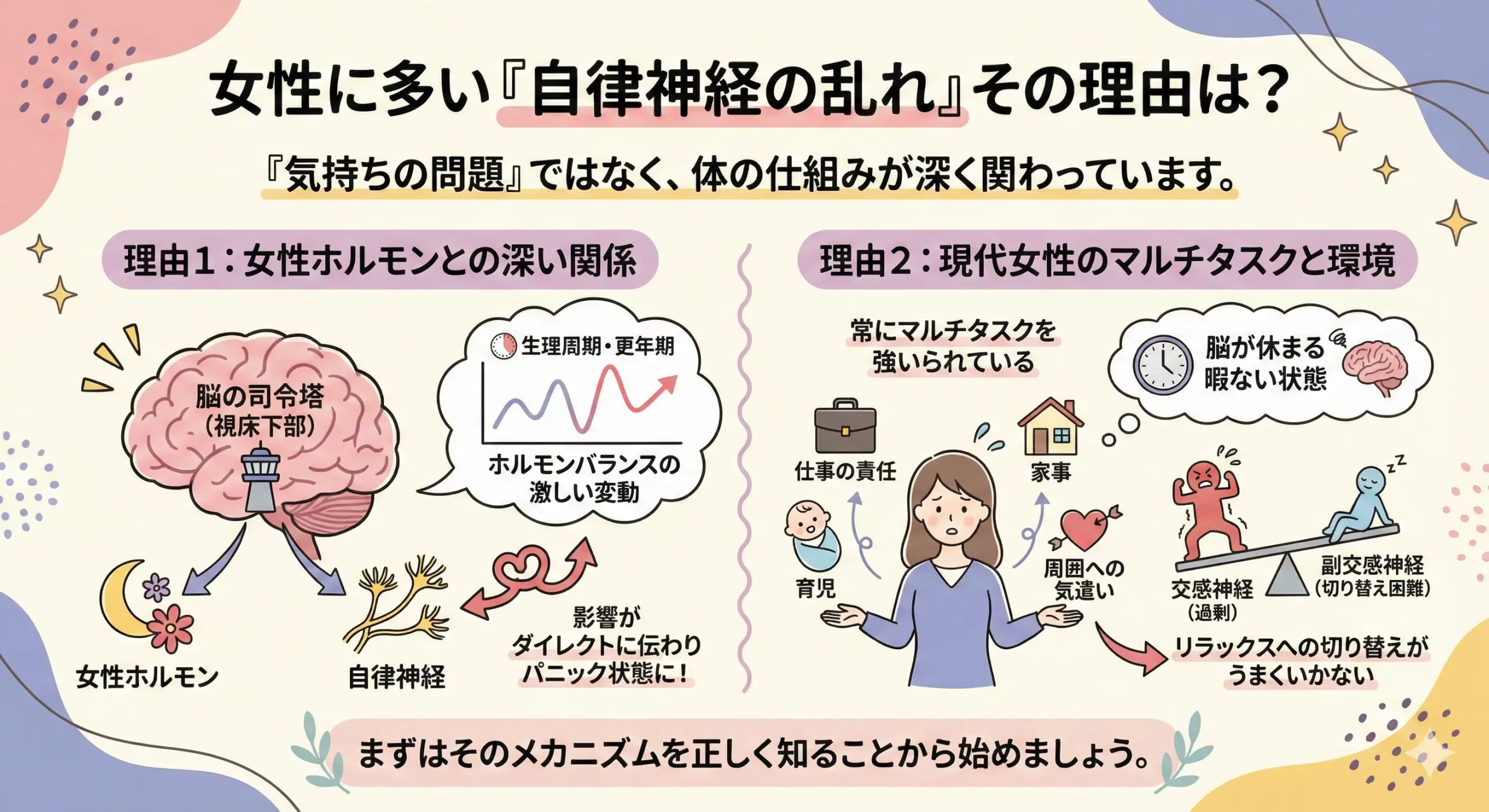 最大の理由は、一生を通じて変化し続ける「女性ホルモン」の存在です。自律神経と女性ホルモンを司る脳の司令塔は、どちらも同じ「視床下部」という場所にあります。そのため、生理周期や更年期などでホルモンバランスが激しく変動すると、その影響がダイレクトに自律神経にも伝わり、パニックを起こしたような状態になってしまうのです。