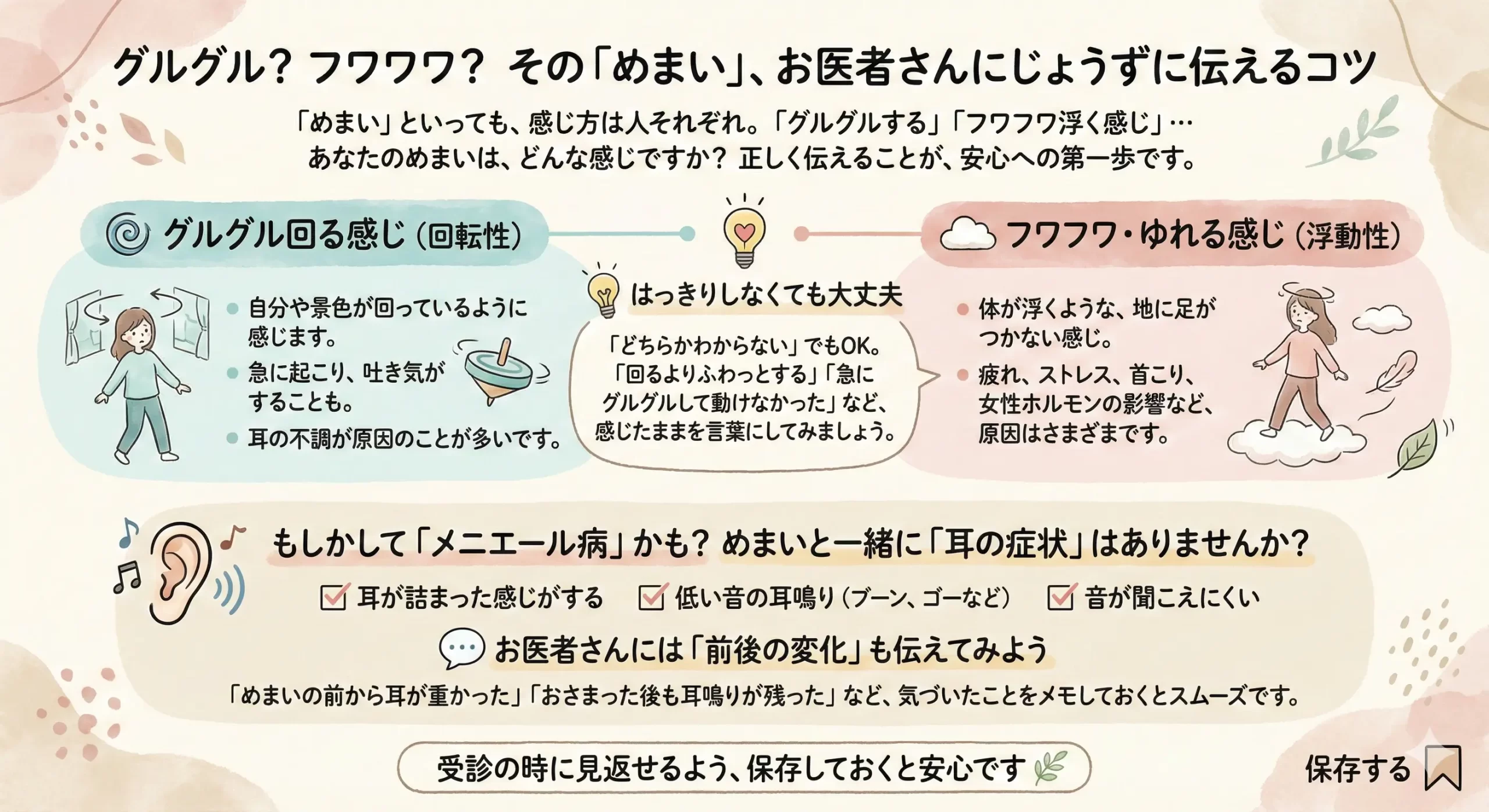 「自分のめまいはどちらか」と問われてもはっきりしない方もいます。それでも構いません。次の受診のときに「回るというより、ふわっとする感じ」「突然グルグルしてしばらく動けなかった」という言葉で伝えるだけで、医師の診断は大きく変わります。