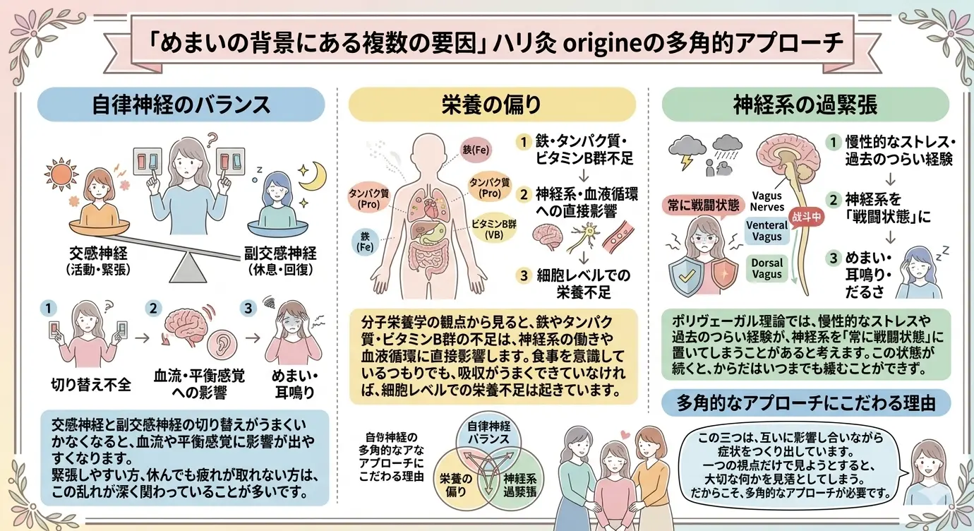 めまいの背景には、複数の要因が絡み合っていることがほとんどです。ハリ灸origineでは、大きく三つの視点からからだの状態を読み取ります。