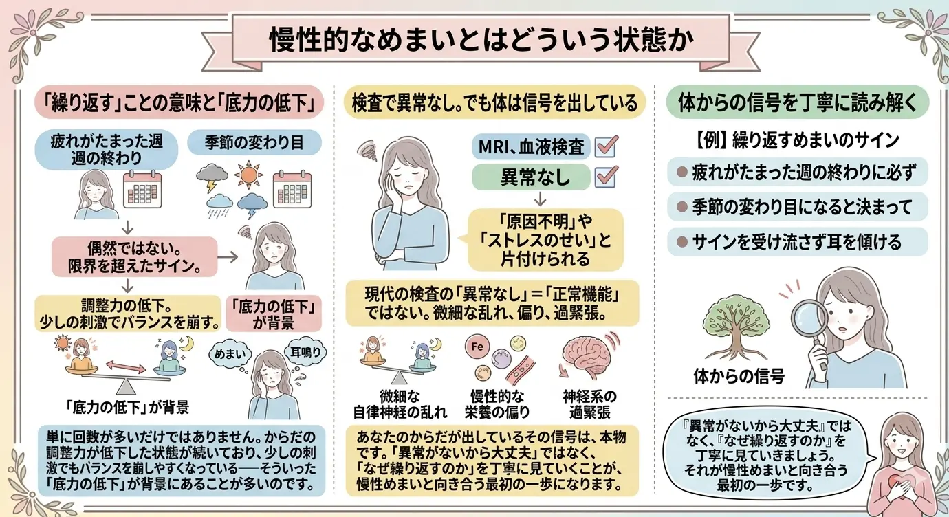 慢性的なめまいとは、単に「めまいの回数が多い」ということではありません。からだの調整力が低下した状態が続いており、少しの刺激でもバランスを崩しやすくなっている——そういった「底力の低下」が背景にあることが多いのです。