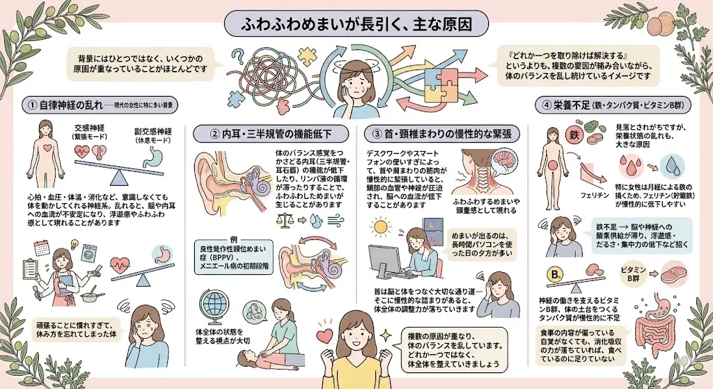 - 自律神経の乱れ・内耳・首の緊張・栄養不足など、めまいが続く主な原因とそのつながり