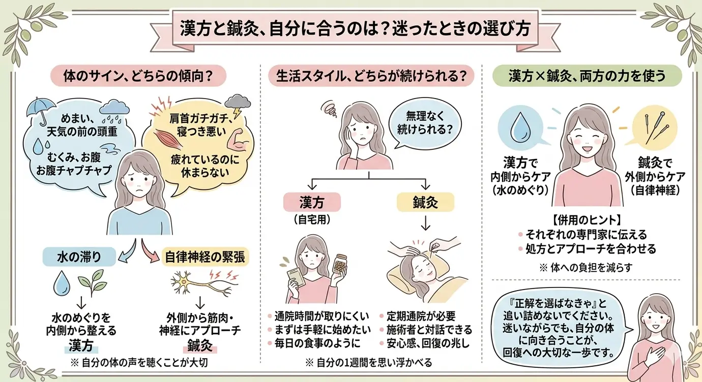 完璧な選択をする必要はありません。漢方を試してみて、合わなければ鍼灸に切り替えてもいい。両方を少しずつ取り入れてみてもいい。大切なのは「自分の体をやさしく丁寧に扱おう」と決めたこと。その気持ちこそが、回復の起点になります。