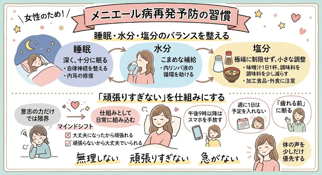 - 睡眠・水分・塩分・「頑張りすぎない仕組み」など、日常に取り入れやすい再発予防の習慣